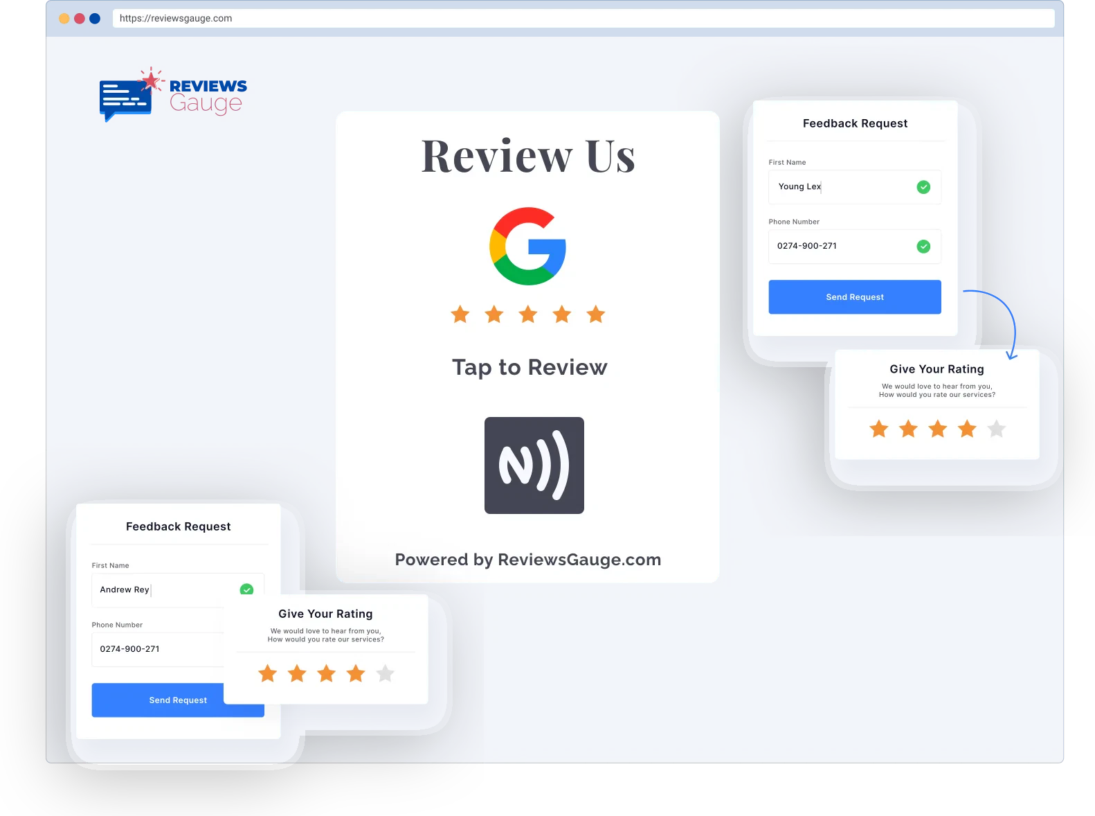 Make it easier than ever for customers to leave a review. With Reviews Gauge’s NFC Review Collection, all they have to do is tap their phone on a branded card, sign, or stand. No QR codes. No typing. Just one tap and they’re on the review page — faster, easier, and more likely to leave feedback.