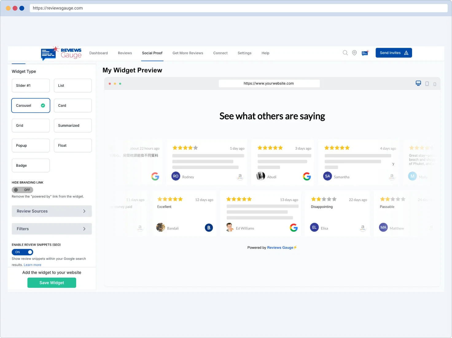 Reviews Gauge makes it easy to turn your best customer feedback into high-converting website content. With over 8 customizable review widgets, you can display your top reviews on landing pages, product pages, or service areas — boosting trust, credibility, and conversions at every step of the buyer journey.